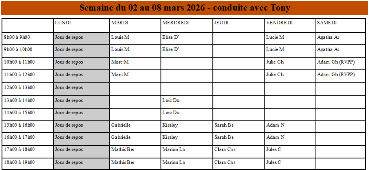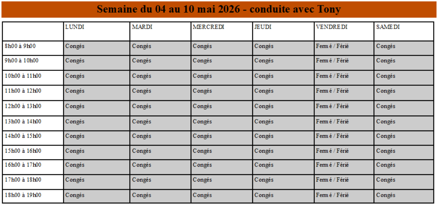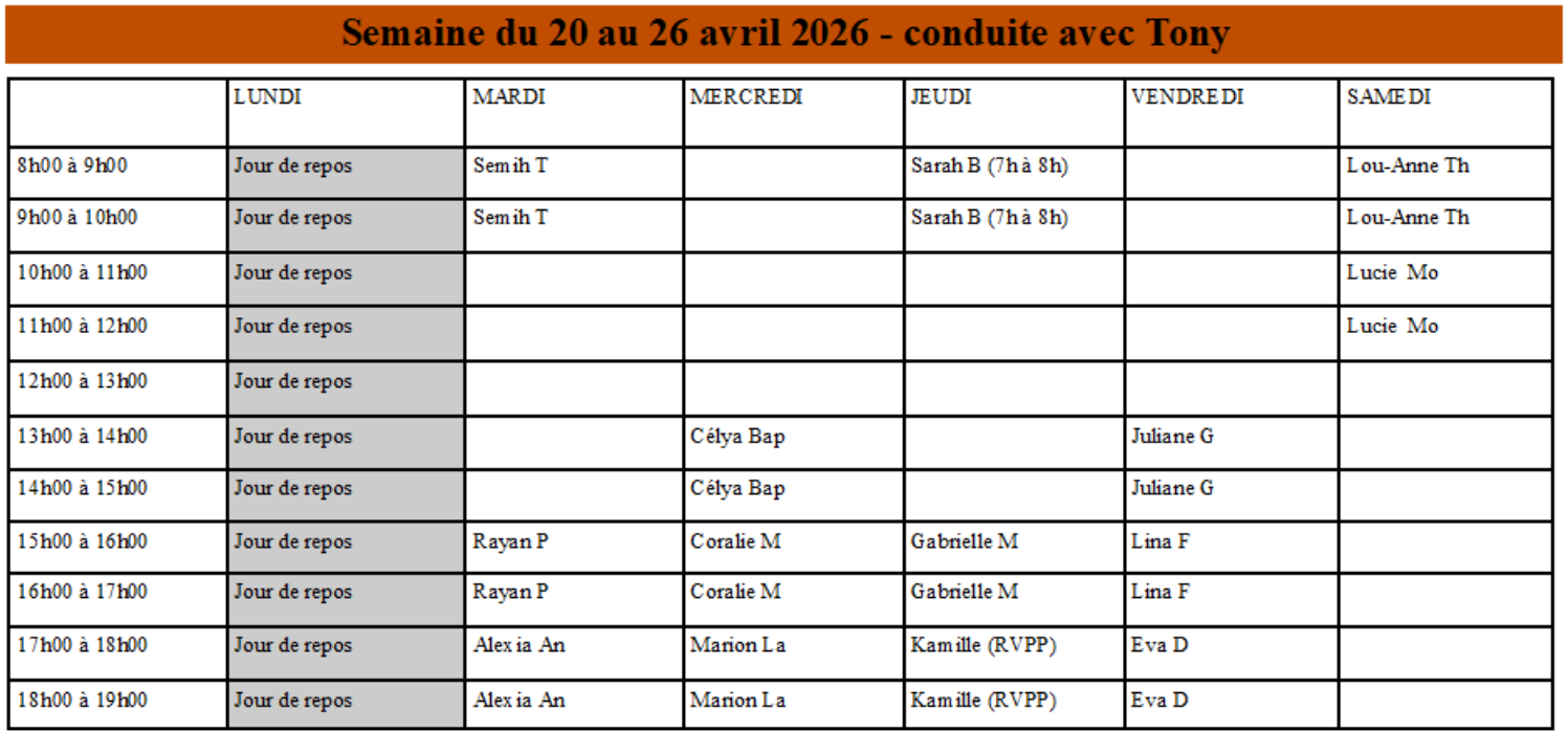 HEURES DE CONDUITEMERCI DE ME FAIRE PARVENIR PAR MAIL VOS DISPONIBILITES POUR LA SEMAINE SUIVANTE AU PLUS TARD LE MARDI SOIR 19h00ET CE CHAQUE SEMAINE ! (sinon aucune heure de conduite au planning)certains élèves ont très peu de disponibilités sur la semaine. Ils devront partager des plages horaires identiques et ne seront donc pas au planning toutes les semaines.IL NE SERA REPONDU A AUCUN SMS CONCERNANT LES DISPONIBILITES.ADRESSE MAIL UNIQUE POUR LES DISPONIBILITES dispo.conduite@laposte.netvous disposez d’une semaine pour faire parvenir vos disponibilités par mail (du mercredi au mardi soir). en conséquence : premier mail arrivé, premier servi.
