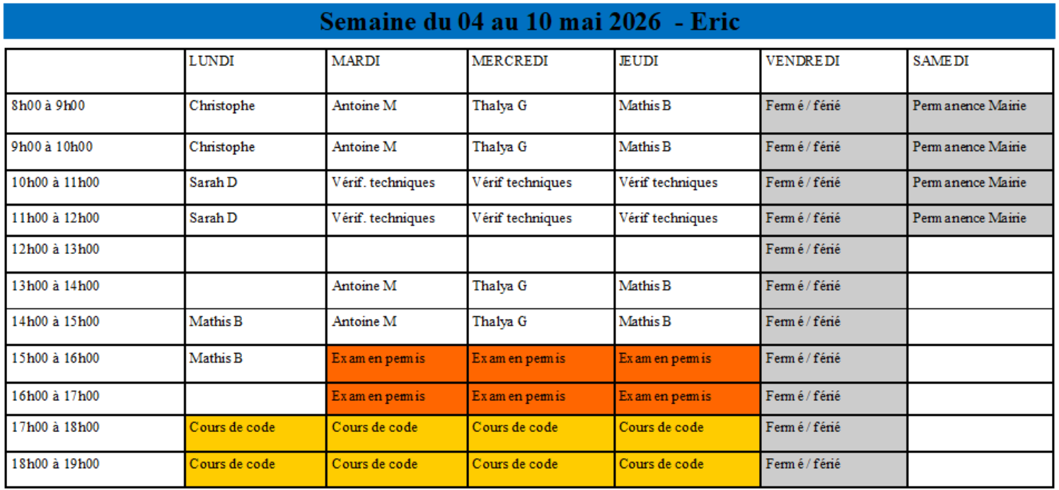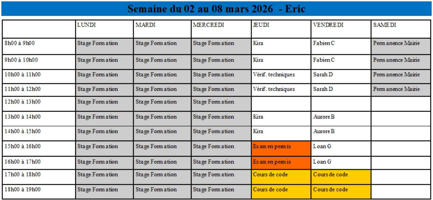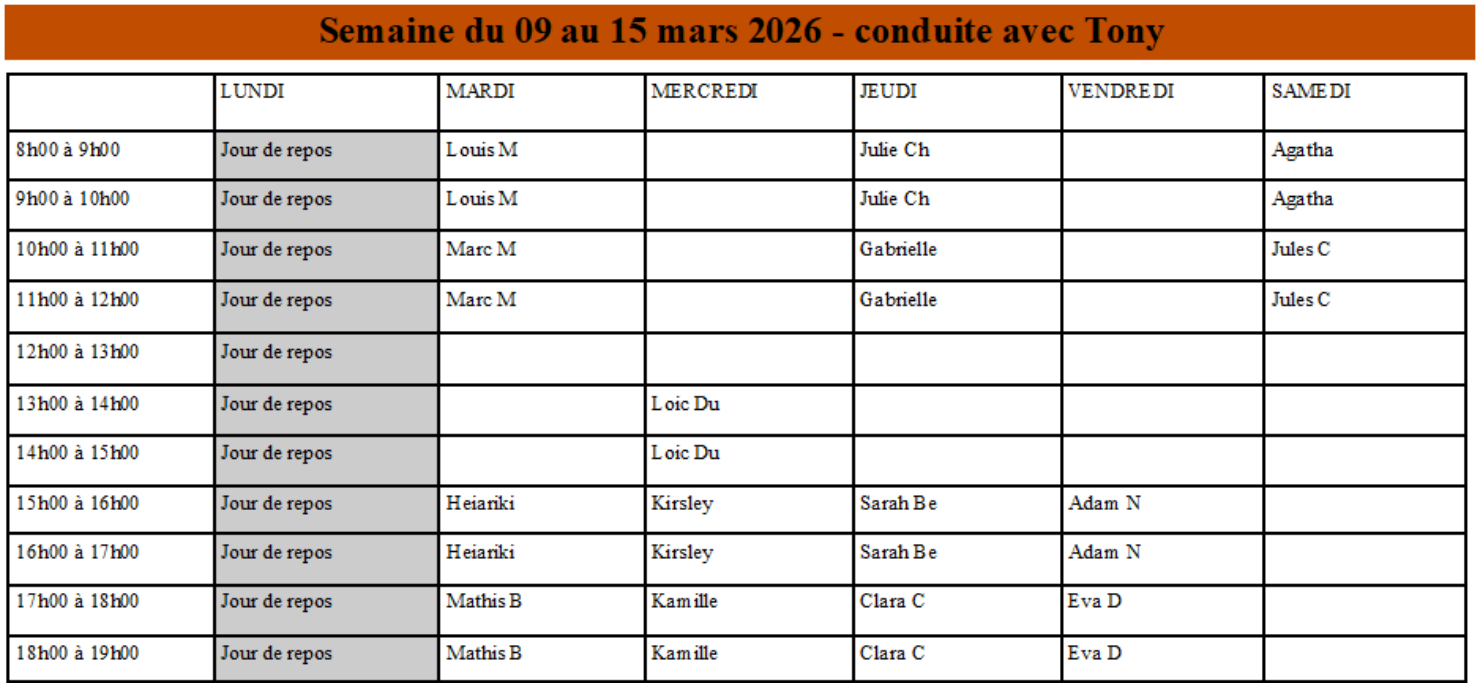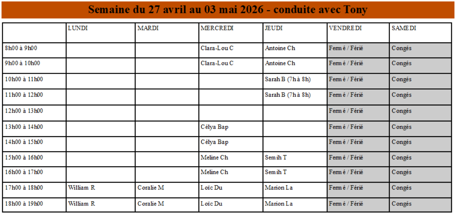 HEURES DE CONDUITEMERCI DE ME FAIRE PARVENIR PAR MAIL VOS DISPONIBILITES POUR LA SEMAINE SUIVANTE AU PLUS TARD LE MARDI SOIR 19h00ET CE CHAQUE SEMAINE ! (sinon aucune heure de conduite au planning)certains élèves ont très peu de disponibilités sur la semaine. Ils devront partager des plages horaires identiques et ne seront donc pas au planning toutes les semaines.IL NE SERA REPONDU A AUCUN SMS CONCERNANT LES DISPONIBILITES.ADRESSE MAIL UNIQUE POUR LES DISPONIBILITES dispo.conduite@laposte.netvous disposez d’une semaine pour faire parvenir vos disponibilités par mail (du mercredi au mardi soir). en conséquence : premier mail arrivé, premier servi.