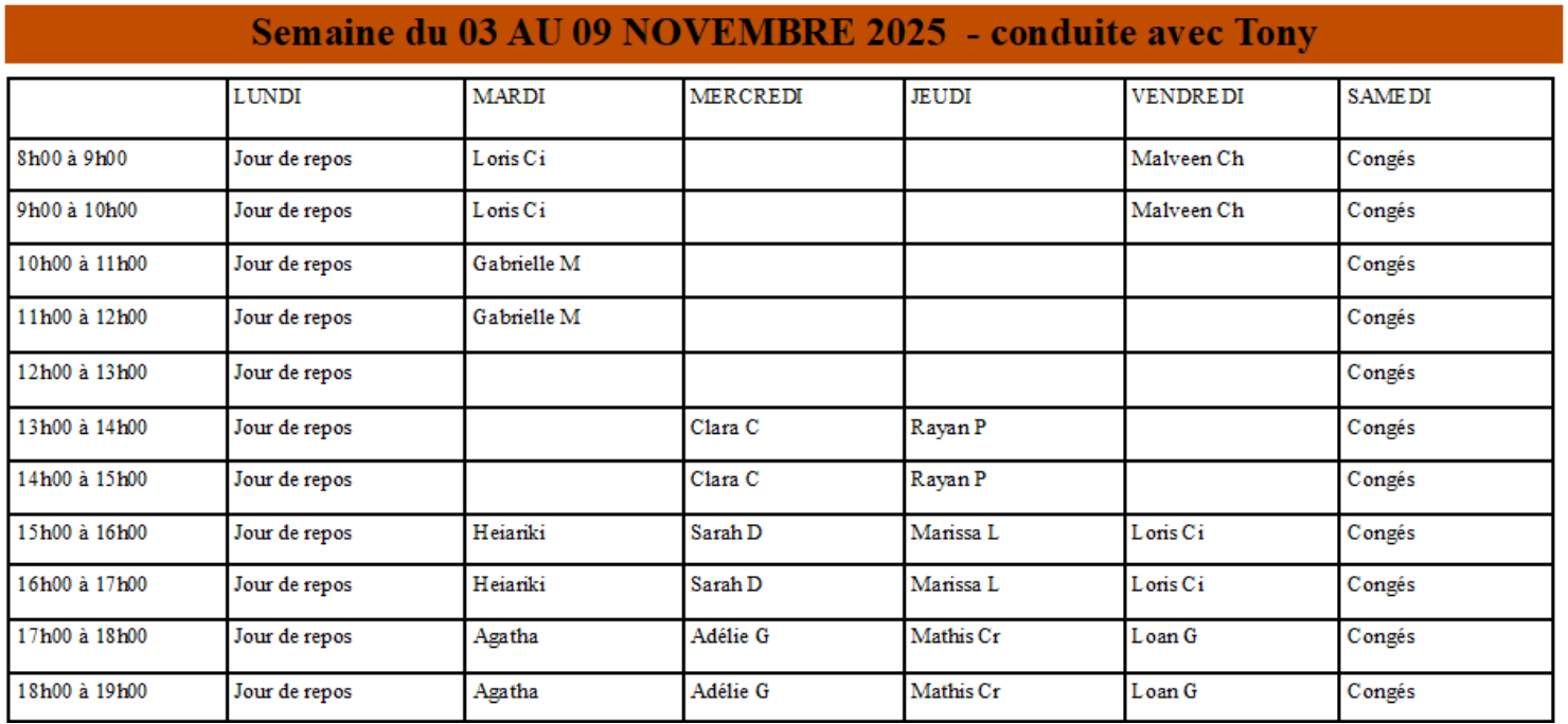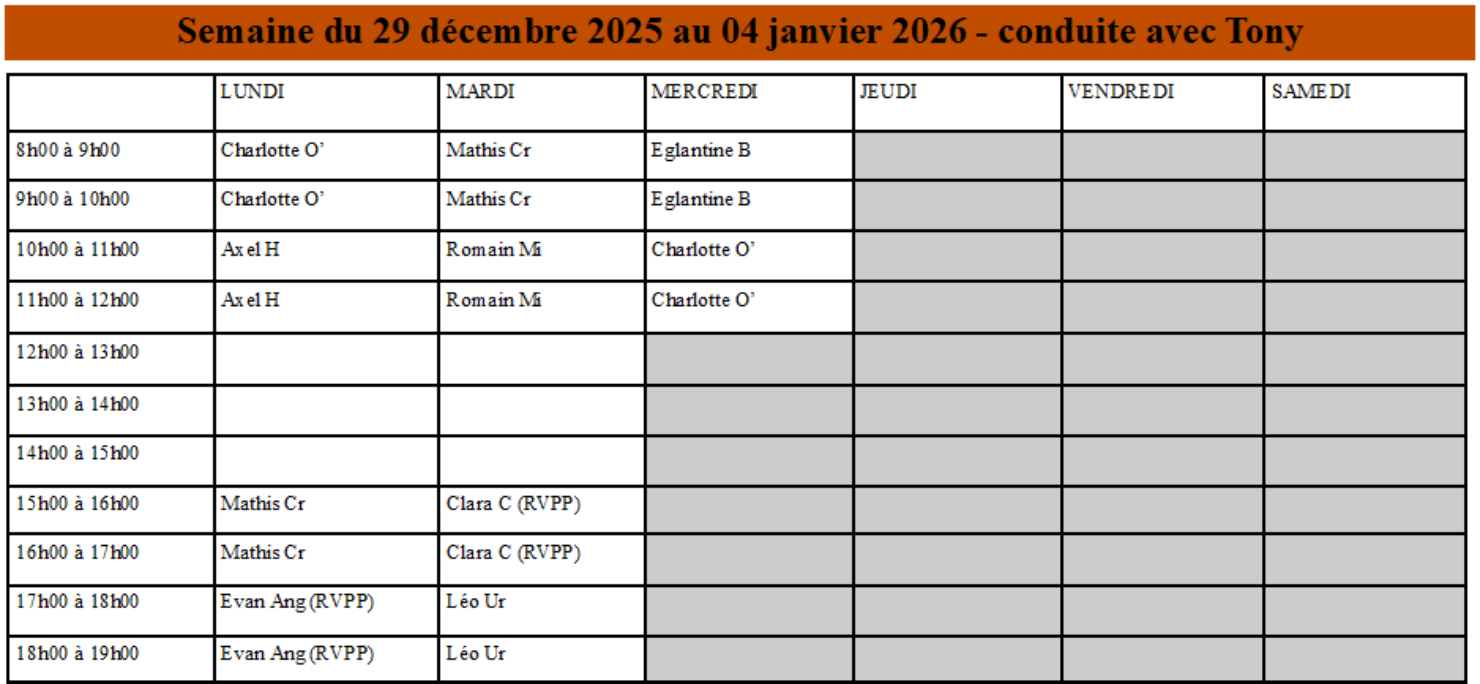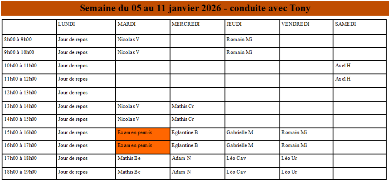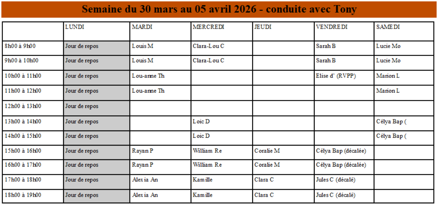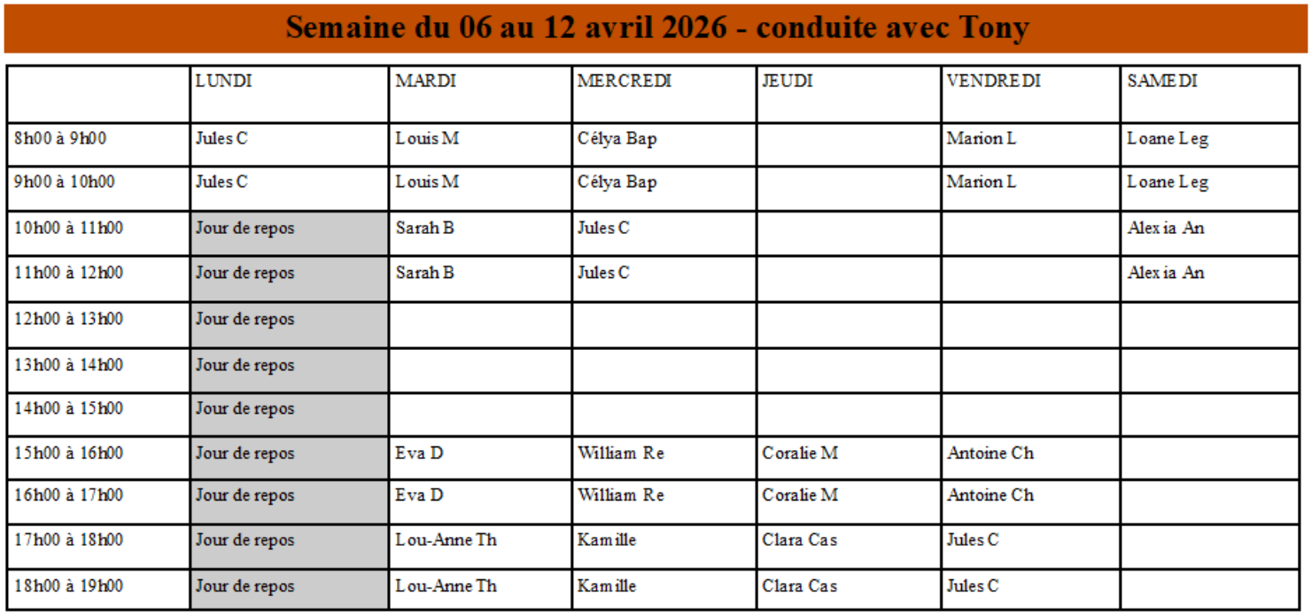 HEURES DE CONDUITEMERCI DE ME FAIRE PARVENIR PAR MAIL VOS DISPONIBILITES POUR LA SEMAINE SUIVANTE AU PLUS TARD LE MARDI SOIR 19h00ET CE CHAQUE SEMAINE ! (sinon aucune heure de conduite au planning)certains élèves ont très peu de disponibilités sur la semaine. Ils devront partager des plages horaires identiques et ne seront donc pas au planning toutes les semaines.IL NE SERA REPONDU A AUCUN SMS CONCERNANT LES DISPONIBILITES.ADRESSE MAIL UNIQUE POUR LES DISPONIBILITES dispo.conduite@laposte.netvous disposez d’une semaine pour faire parvenir vos disponibilités par mail (du mercredi au mardi soir). en conséquence : premier mail arrivé, premier servi.